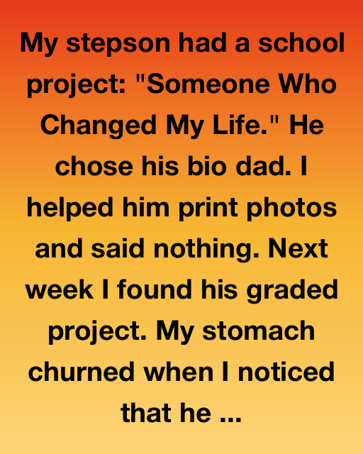 My stepson had a school project: “Someone Who Changed My Life.” He chose his bio dad. I helped him print photos and said nothing. Next week I found his graded project. My stomach churned when I noticed that he had glued a small, handwritten note over his father’s face on the final page.