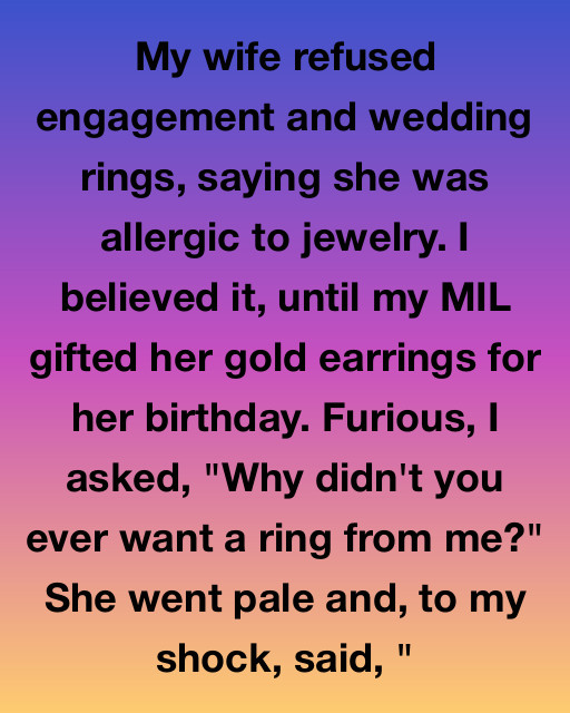 My wife refused engagement and wedding rings, saying she was allergic to jewelry. I believed it, until my MIL gifted her gold earrings for her birthday. Furious, I asked, “Why didn’t you ever want a ring from me?” She went pale and, to my shock, said, “It wasn’t the gold I was allergic to, Adam. It was the target.“