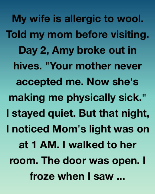 My wife is allergic to wool. Told my mom before visiting. Day 2, Amy broke out in hives. “Your mother never accepted me. Now she’s making me physically sick.” I stayed quiet. But that night, I noticed Mom’s light was on at 1 AM. I walked to her room. The door was open. I froze when I saw my mother sitting on the edge of her bed, her hands trembling as she shoved a pile of expensive, hand-knitted sweaters into a heavy black garbage bag.