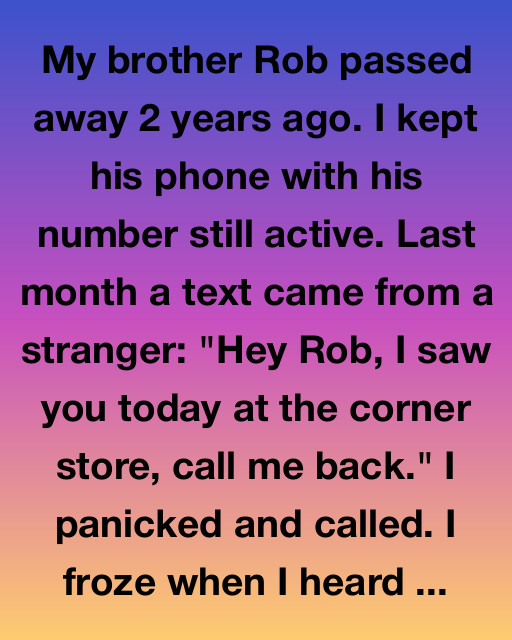 My brother Rob passed away 2 years ago. I kept his phone with his number still active. Last month a text came from a stranger: “Hey Rob, I saw you today at the corner store, call me back.” I panicked and called. I froze when I heard the voice on the other end.