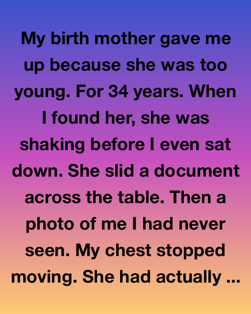 My birth mother gave me up because she was too young. For 34 years, I had imagined this moment in a thousand different ways, usually involving tears or a stiff, awkward apology. When I finally found her, she was shaking before I even sat down. She slid a document across the table. Then a photo of me I had never seen. My chest stopped moving. She had actually kept a meticulous record of every single day since I was born.