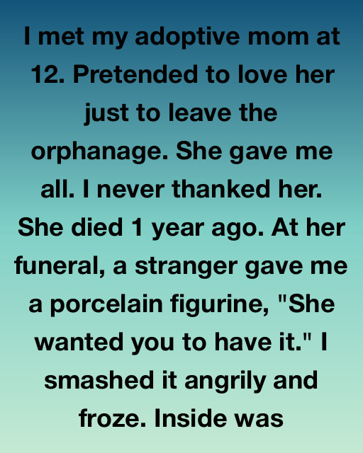 I met my adoptive mom at 12. Pretended to love her just to leave the orphanage. She gave me all. I never thanked her. She died 1 year ago. At her funeral, a stranger gave me a porcelain figurine, “She wanted you to have it.” I smashed it angrily and froze. Inside was a decades-old contract showing she hadn’t just adopted me—she had bought the orphanage.