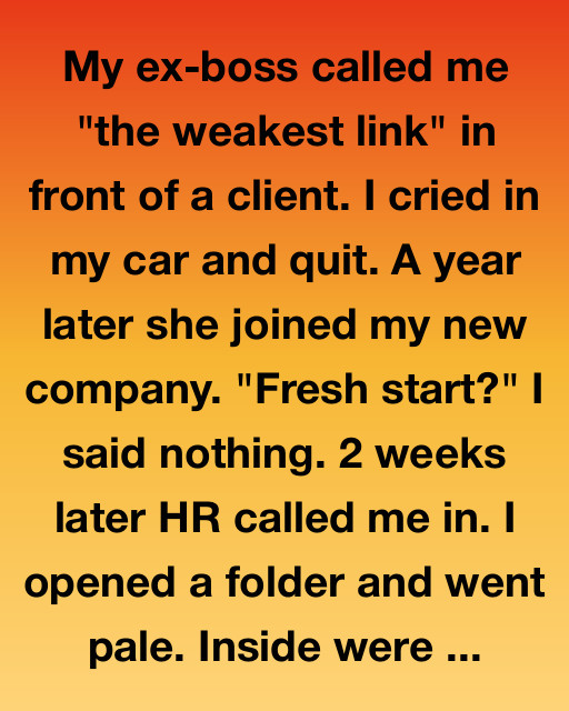 My ex-boss called me “the weakest link” in front of a client. I cried in my car and quit. A year later she joined my new company. “Fresh start?” I said nothing. 2 weeks later HR called me in. I opened a folder and went pale. Inside were three separate complaints about my performance, all filed in the last forty-eight hours.