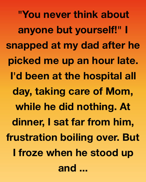 “You never think about anyone but yourself!” I snapped at my dad after he picked me up an hour late. I’d been at the hospital all day, taking care of Mom, while he did nothing. At dinner, I sat far from him, frustration boiling over. But I froze when he stood up and swayed dangerously, his face turning a sickly shade of gray before he slumped back into his wooden chair.