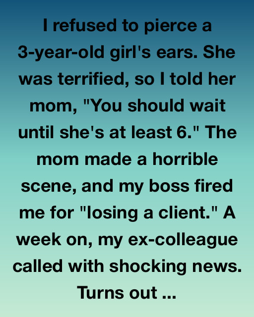 I refused to pierce a 3-year-old girl’s ears. She was terrified, so I told her mom, “You should wait until she’s at least 6.” The mom made a horrible scene, and my boss fired me for “losing a client.” A week on, my ex-colleague called with shocking news. Turns out that simple “no” had started a landslide that was currently burying the entire shop.