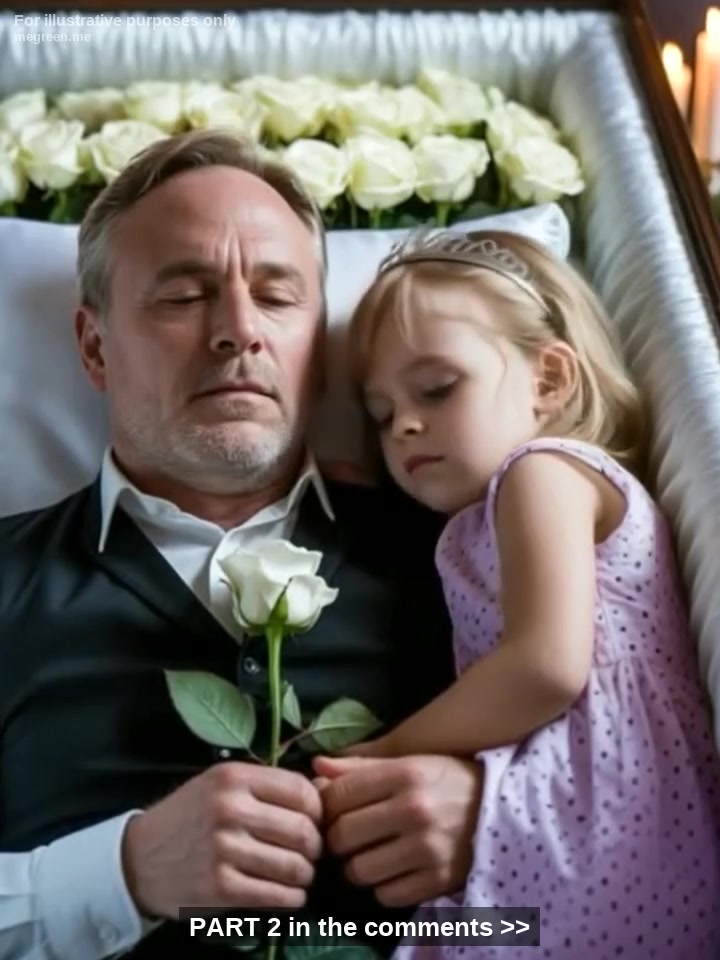 My eyes widened. She lay down beside Dad, her tiny body curled up next to his still, cold form. Her head rested near his shoulder, her hand instinctively reaching out to clasp his. It was a heartbreaking sight, a child seeking comfort from the one person who could no longer give it.