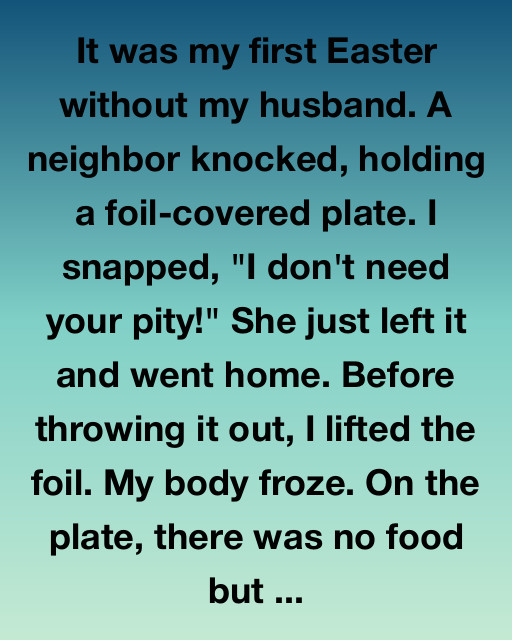 It was my first Easter without my husband. A neighbor knocked, holding a foil-covered plate. I snapped, “I don’t need your pity!” She just left it and went home. Before throwing it out, I lifted the foil. My body froze. On the plate, there was no food but a small, worn-out wooden box and a handwritten note that simply said, “He told me to wait.”
