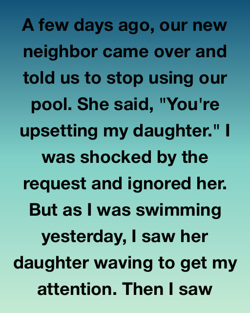 A few days ago, our new neighbor came over and told us to stop using our pool. She said, “You’re upsetting my daughter.” I was shocked by the request and ignored her. But as I was swimming yesterday, I saw her daughter waving to get my attention. Then I saw the little girl wasn’t waving to me, but was making highly specific, silent hand gestures, and her mother was meticulously filming the scene, not me, but the pattern of the water’s reflection on the wall behind me.