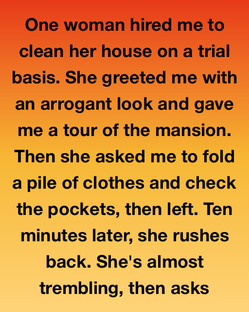 She greeted me with an arrogant look and gave me a tour of the mansion. Then she asked me to fold a pile of clothes and check the pockets, then left. Ten minutes later, she rushes back. She’s almost trembling, then asks,