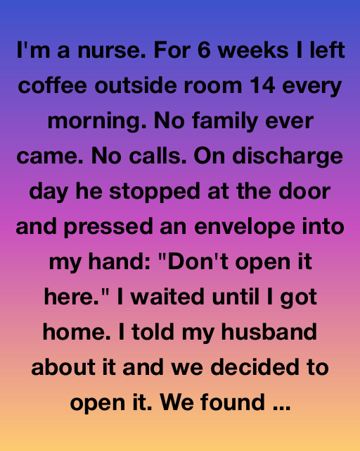 I’m a nurse. For 6 weeks I left coffee outside room 14 every morning. No family ever came. No calls. On discharge day he stopped at the door and pressed an envelope into my hand: “Don’t open it here.” I waited until I got home. I told my husband about it and we decided to open it. We found three handwritten pages and a set of rusted keys that smelled faintly of salt and motor oil.