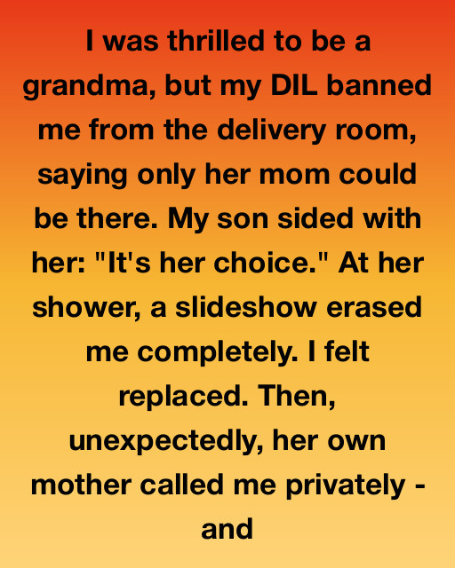 I was thrilled to be a grandma, but my DIL banned me from the delivery room, saying only her mom could be there. My son sided with her: “It’s her choice.” At her shower, a slideshow erased me completely. I felt replaced. Then, unexpectedly, her own mother called me privately – and she didn’t call to gloat; she called to confess a secret that instantly changed everything I thought I knew about my son, my daughter-in-law, and the entire situation.