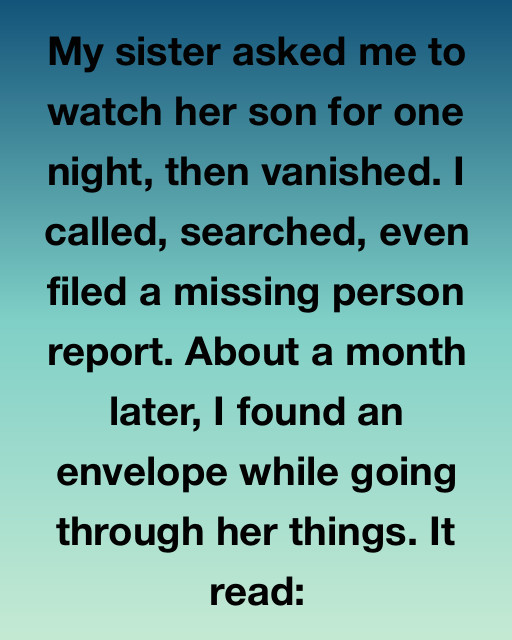 My sister asked me to watch her son for one night, then vanished. I called, searched, even filed a missing person report. About a month later, I found an envelope while going through her things. It read: “To the one who stayed when I couldn’t.”