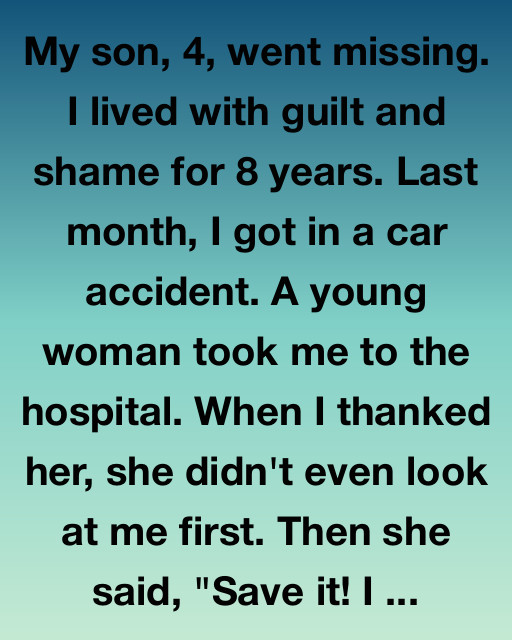 My son, 4, went missing. I lived with guilt and shame for 8 years. Last month, I got in a car accident. A young woman took me to the hospital. When I thanked her, she didn’t even look at me first. Then she said, “Save it! I didn’t do it for you. I did it because it was the right thing to do, even if you never did the same for anyone.”
