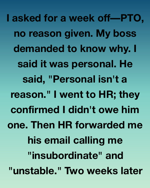 I asked for a week off—PTO, no reason given. My boss demanded to know why. I said it was personal. He said, “Personal isn’t a reason.” I went to HR; they confirmed I didn’t owe him one. Then HR forwarded me his email calling me “insubordinate” and “unstable.” Two weeks later my boss, Mr. Sterling, was suddenly gone, and the entire department was placed under a mandatory, indefinite corporate freeze.