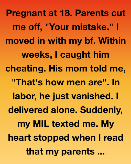 Pregnant at 18. Parents cut me off, “Your mistake.” I moved in with my bf. Within weeks, I caught him cheating. His mom told me, “That’s how men are”. In labor, he just vanished. I delivered alone. Suddenly, my MIL texted me. My heart stopped when I read that my parents had just sold their house and were moving across the country without saying goodbye.