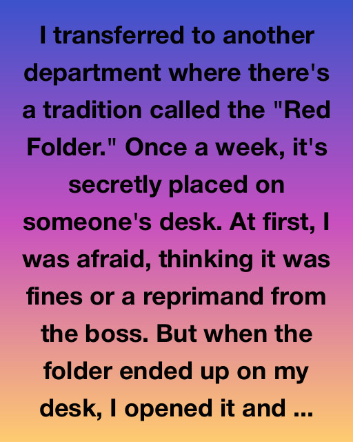 I transferred to another department where there’s a tradition called the “Red Folder.” Once a week, it’s secretly placed on someone’s desk. At first, I was afraid, thinking it was fines or a reprimand from the boss. But when the folder ended up on my desk, I opened it and found a single, hand-written note on cream-colored stationery.